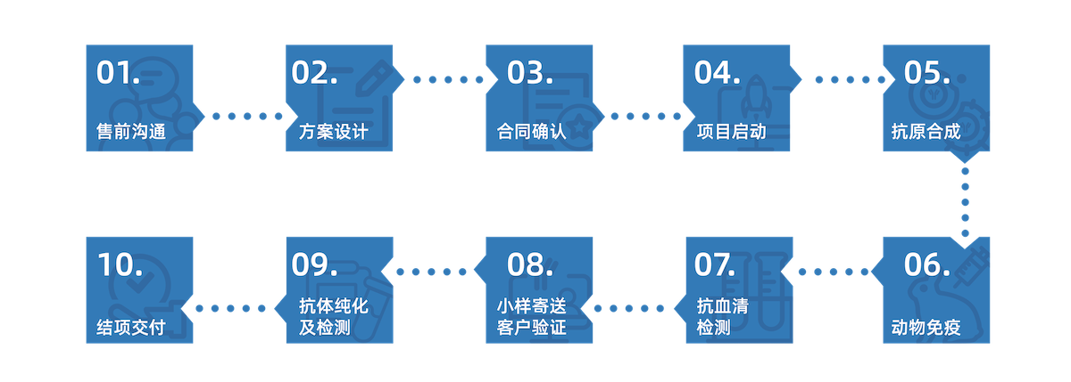 | 合成タンパク質から精製抗体まで | タンパク質を設計・合成し、動物を免疫し、血清サンプルのELISA品質管理が合格した後、採血・精製・納品。 | Protein A/抗原親和性精製抗体、精製後の残り血清、プロジェクト完了報告書。 | 12-15週間 |