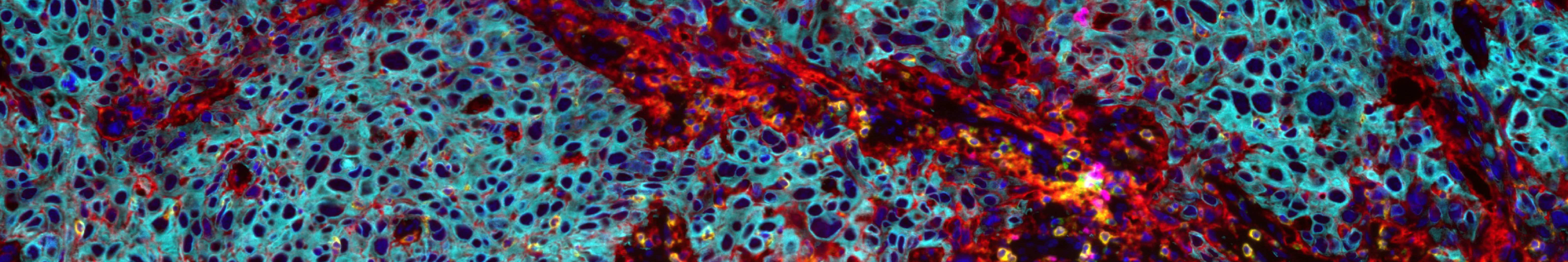 | 赤/CD11b、緑/CD31、白/aSMA、シアン/CD3、シアン-緑/pan CK、青/DAPI |