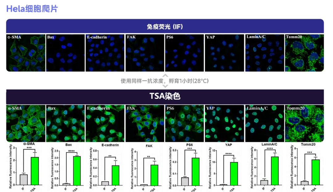 *相同实验条件下(一抗浓度,孵育时间),与传统IF染色技术相比,TSA染色可以显著增强荧光信号。