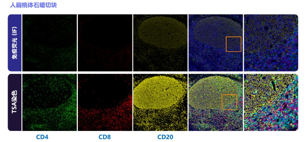 *相同实验条件下(一抗浓度,孵育时间),与传统IF染色技术相比,TSA染色可以显著增强CD4/CD8/CD20 荧光信号。