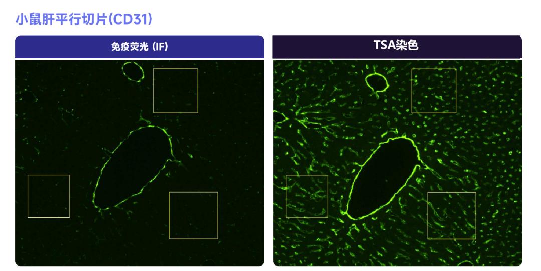 *相同实验条件下(一抗浓度,孵育时间),与传统IF染色技术相比,TSA染色方法对肝脏低表达的CD31检测灵敏度更高,有效标记了肝实质微小血管网络。