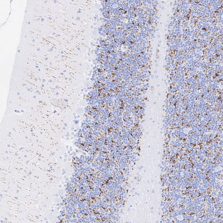 Immunohistochemical analysis of paraffin-embedded mouse cerebellum tissue with Mouse anti-VGLUT2 antibody (HA601451) at 1/2,000 dilution.
