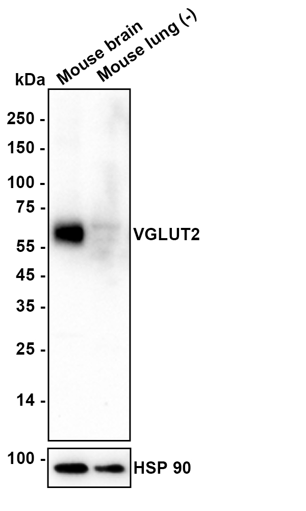 Western blot analysis of VGLUT2 on different lysates with Mouse anti-VGLUT2 antibody (HA601451) at 1/5,000 dilution.