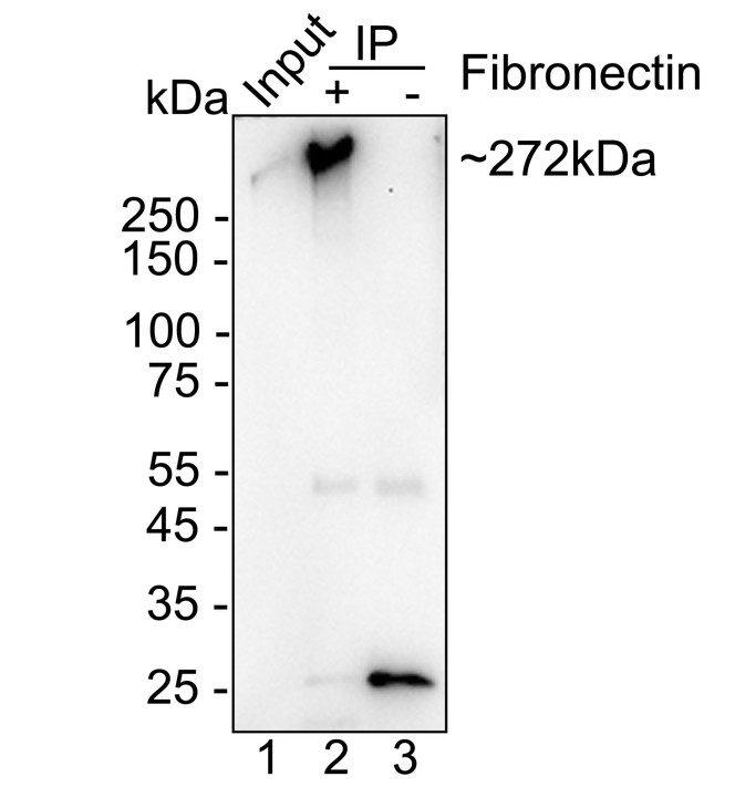 Fibronectin was immunoprecipitated from 0.2 mg HepG2 cell lysate with HA723610 at 2 µg/10 µl beads. Western blot was performed from the immunoprecipitate using HA723610 at 1/2,000 dilution. HRP Conjugated Anti-Rabbit IgG for IP Nano-secondary antibody at 1/5,000 dilution was used for 1 hour at room temperature.